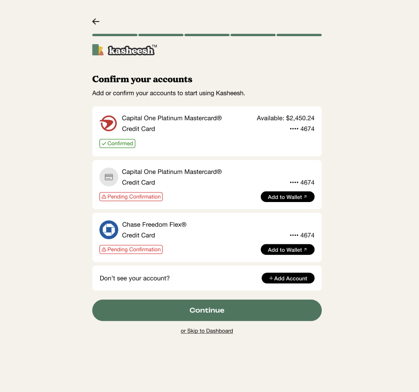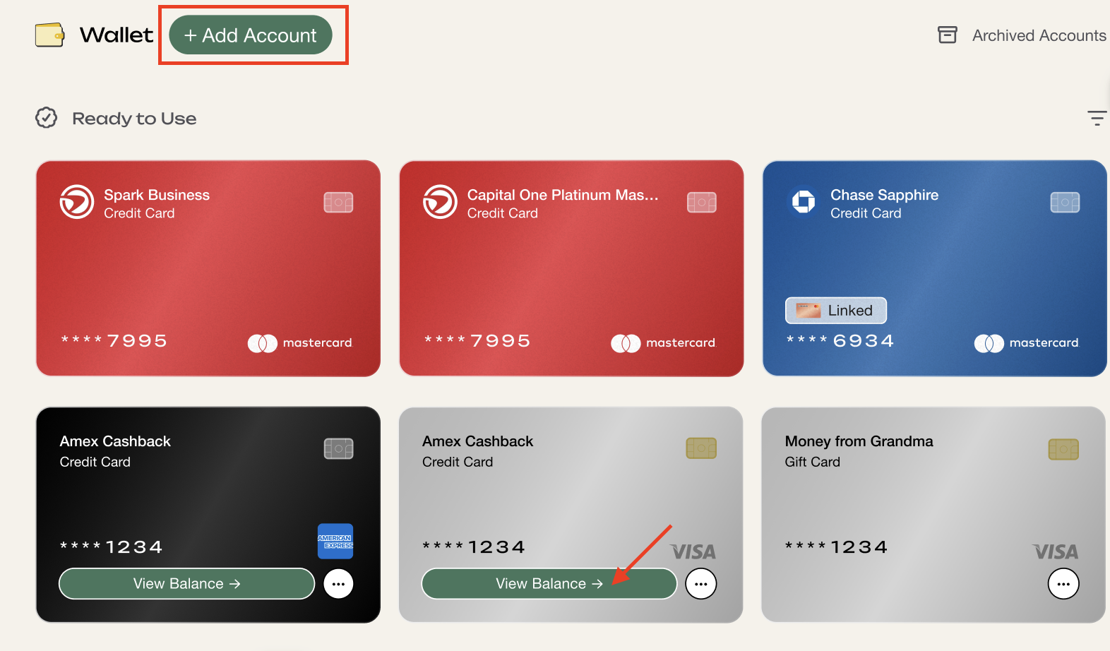 Select the Wallet tab from your account's top navigation menu, then choose + Add Account to add any additional cards to your Kasheesh account. If you did not confirm your card during onboarding, please note that selecting View Balance will also prompt you to complete the linking process through Plaid.Benefits of linking with Plaid: